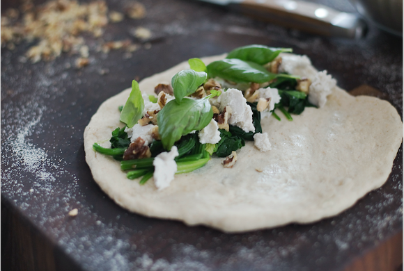 Calzone mit Spinat, Walnüssen, Cashew-Mozzarella und Basilikum