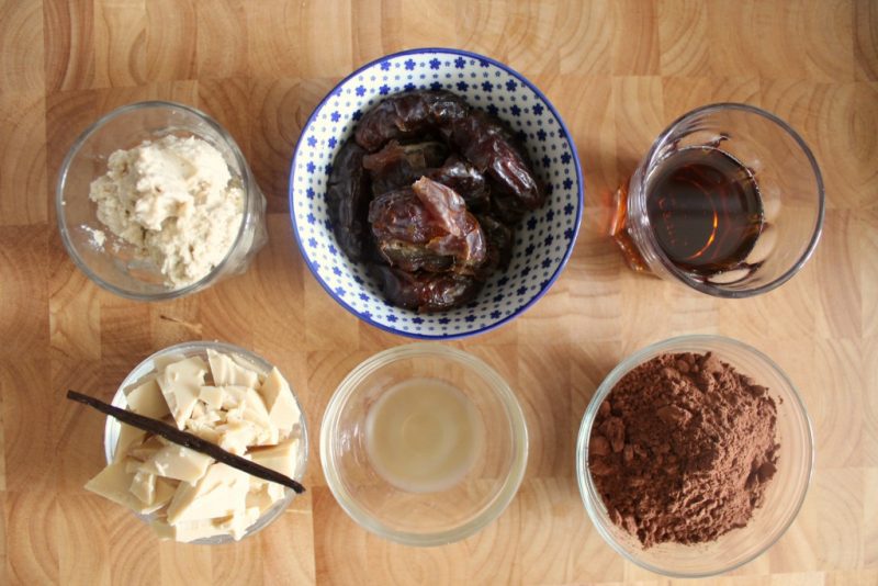 Das Wasser von den Datteln abgießen und diese mit einer Gabel zerdrücken, gröbere Hautstücke entfernen. Die Dattelmasse zusammen mit der Kakaobutter, dem Kakaopulver, dem Reissirup, dem ausgekratzten Inhalt der Vanilleschote, der Cashewbutter und der Sojasoße im Mixer/ Küchenmaschine zu einer cremigen, feinen Masse verarbeiten.